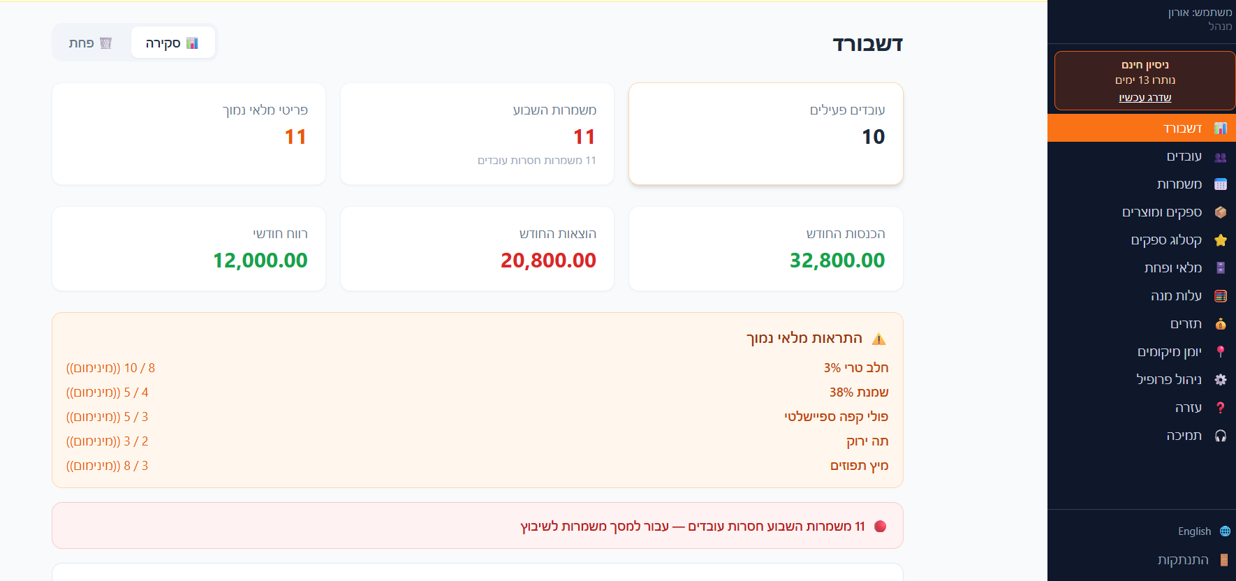 פלטפורמת ניהול מקצה לקצה המיועדת לפתור את הכאבים התפעוליים של בעלי עסקים בתחום המזון הנייד. המערכת מותאמת לעבודה דינמית בארץ ובעולם, עם דגש על אוטומציה של כוח אדם וניהול מלאי חכם. תכונות ליבה: ניהול כוח אדם ושיבוץ חכם (Smart Scheduling): מודול זמינות: עובדים מזינים זמינות שבועית דרך אזור אישי ייעודי. מנוע שיבוץ אוטומטי: המערכת מייצרת סידור עבודה בלחיצת כפתור, בהתבסס על הגדרות כמות עובדים נדרשת, תפקידים הכרחיים (למשל: בריסטה, אחמ"ש) וזמינות העובדים. שיבוץ ידני: אפשרות להתערבות ושינויים ידניים בלוח המשמרות. מערכת הרשאות רב-שכבתית (Multi-Role Permissions): בעלים/מנהל: גישה מלאה לכל הנתונים, דשבורד סיכום, ניהול מנויים והרשאות. מנהל משמרת: הרשאה מותאמת אישית לצפייה וניהול מלאי ושיבוץ עובדים בלבד. עובד: ממשק "רזה" המאפשר שליחת זמינות וצפייה בסידור העבודה האישי בלבד. ניהול מלאי ושרשרת אספקה: מעקב אחר מלאי מוצרים ושיוך לספקים. הזמנות חכמות: התראות על מלאי נמוך ויצירת הזמנת רכש מוכנה לשליחה ישירה לספק ב-WhatsApp. ניהול פחת ומחשבון עלות מנה (Food Cost) לדיוק הרווחיות. לוגיסטיקה וניהול עסק: יומן מיקומים: ניהול ומעקב אחר פריסת העגלה במיקומים שונים (קריטי לפודטראקים). ממשק סופר-אדמין: שליטה מלאה של מפתח המערכת על ניהול המנויים, תשלומים וביצועי המערכת.
