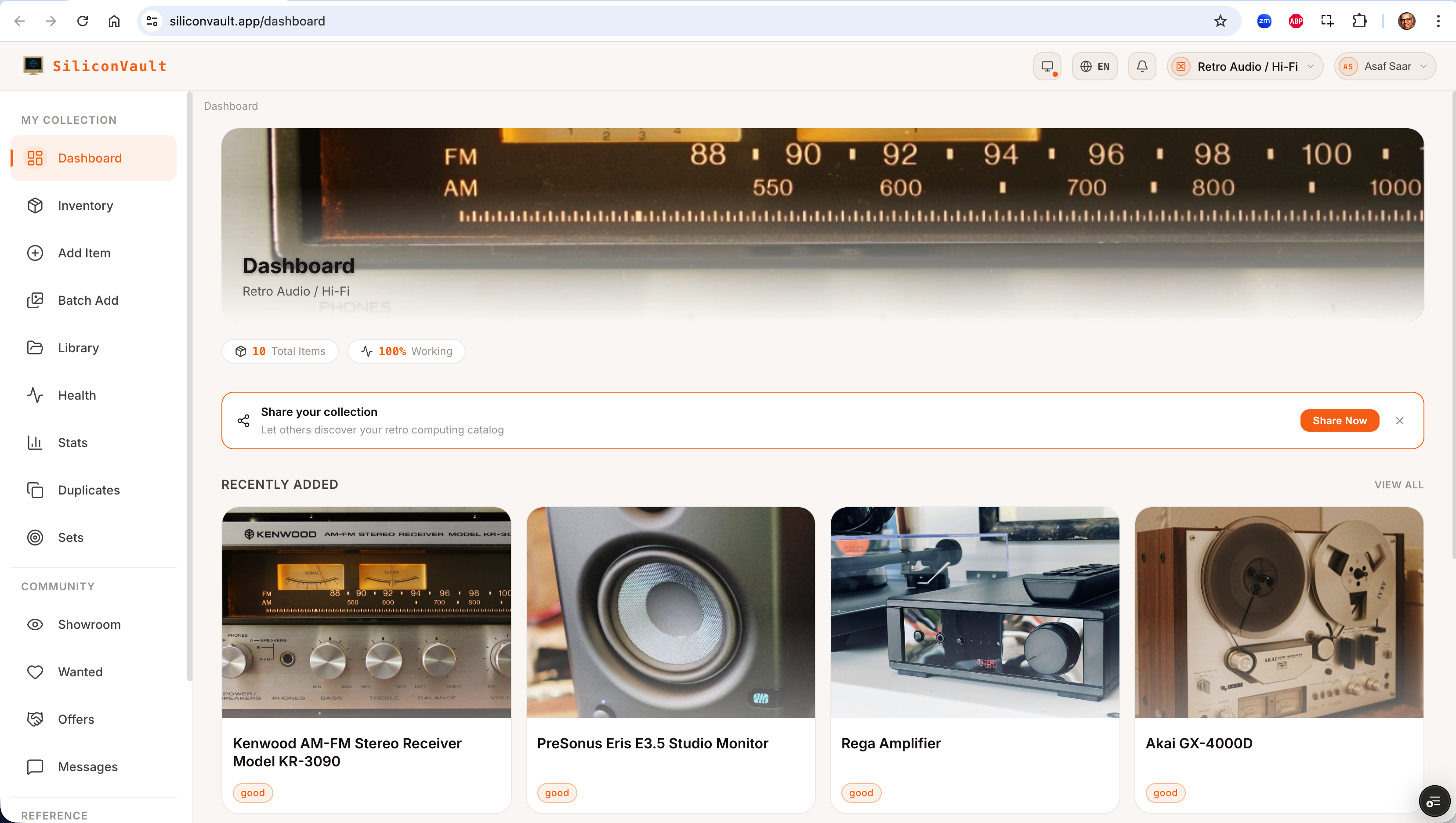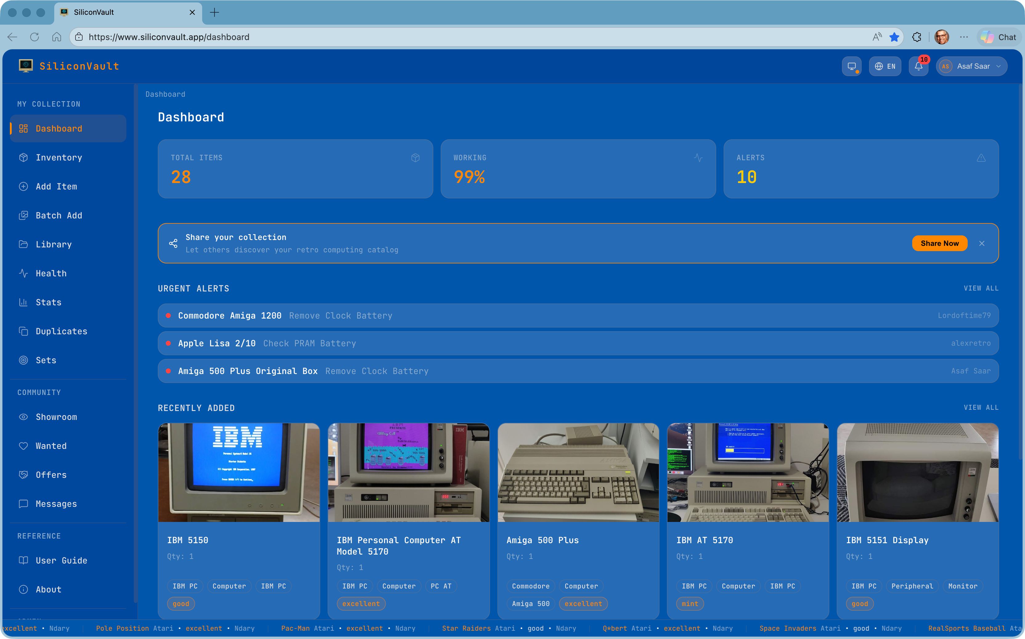 A comprehensive inventory management system for collectors. Retro computers, vintage cameras, watches, hi-fi gear — catalog your collection, track condition and history, and manage documentation across dedicated vaults.