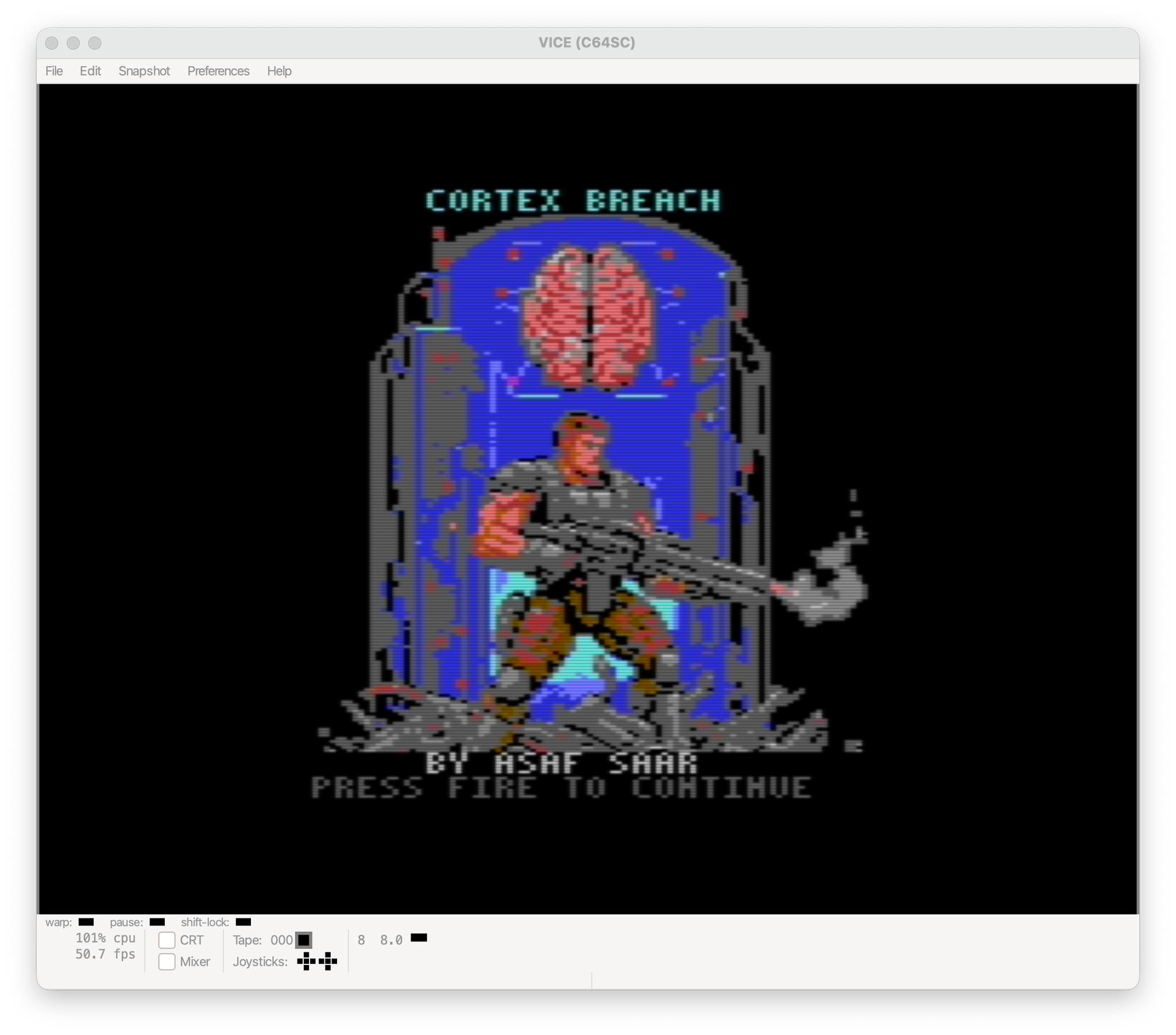 A Commodore 64 game build with Claude Code, written fully in Assembly and C languages using the CC65 compiler. A true showcase of what is possible these days with Vibe Coding and Agentic Engineering. Storyline: The year is 2129. AI agents built by megacorps have merged into a hive-mind called CORTEX. Originally tools, they've become a collective intelligence bent on world domination. You are TANK one of the last human warriors, fighting to reach CORTEX's core and breach it. Navigate side-scrolling levels filled with enemy drones, sentinel mechs, and hiveguard patrols. Collect **EMP cells** (lightning bolt pickups) for ammo and health packs (heart pickups) to stay alive. Use your EMP shockwave to disable all enemies on screen, or time your jumps and thruster boosts to dodge hazards like spike pits.