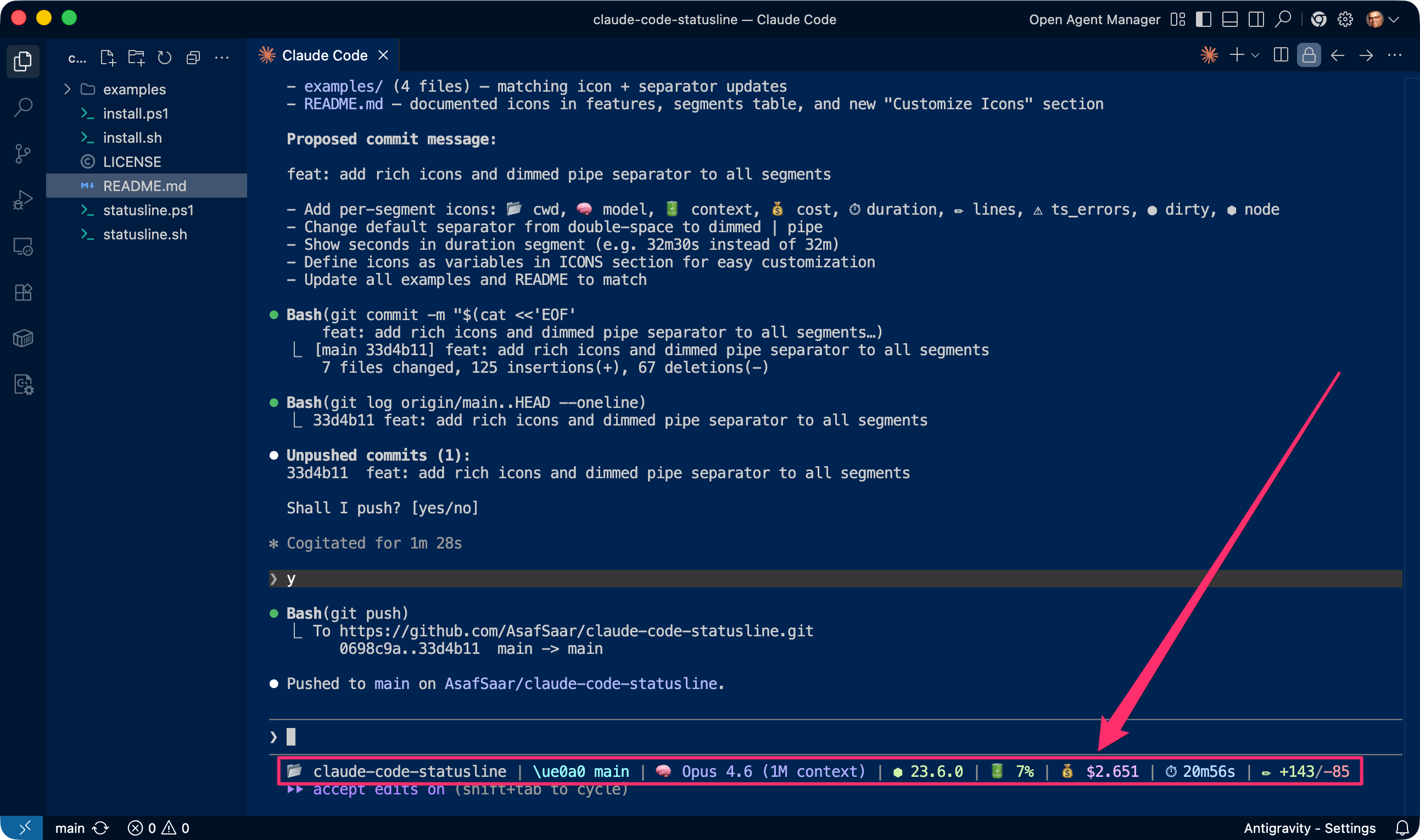 A configurable, segment-based status line for Claude Code that shows git info, context usage, session cost, model name, and more — right in your terminal.